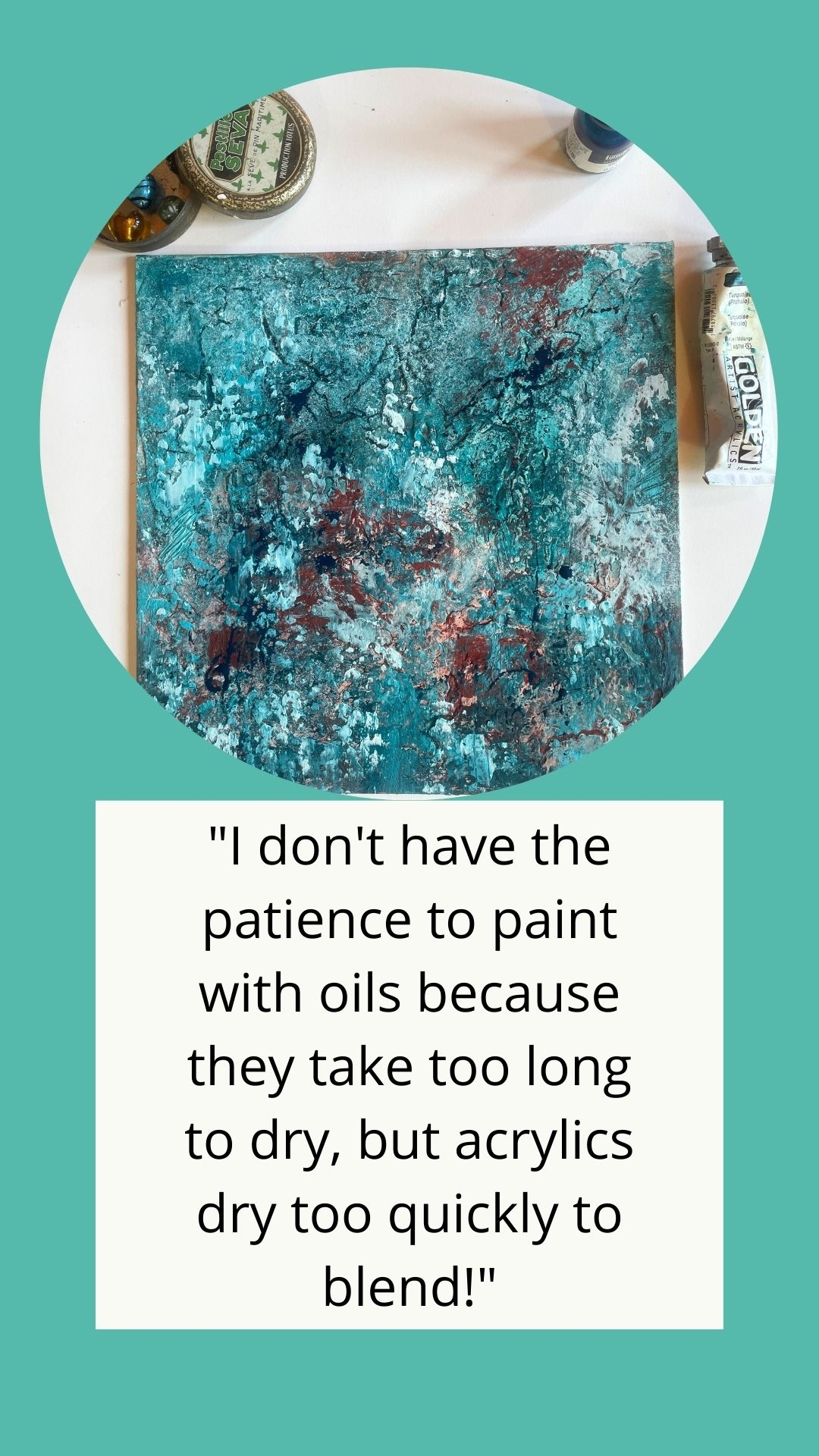 This class is designed specifically for acrylics with Powerwax water-based cold wax. Powerwax is not compatible with oil paints. If you prefer working with oils, check out my Cold Wax Medium & Oils — The Basics class where I teach similar techniques using Gamblin cold wax medium with oil paints!